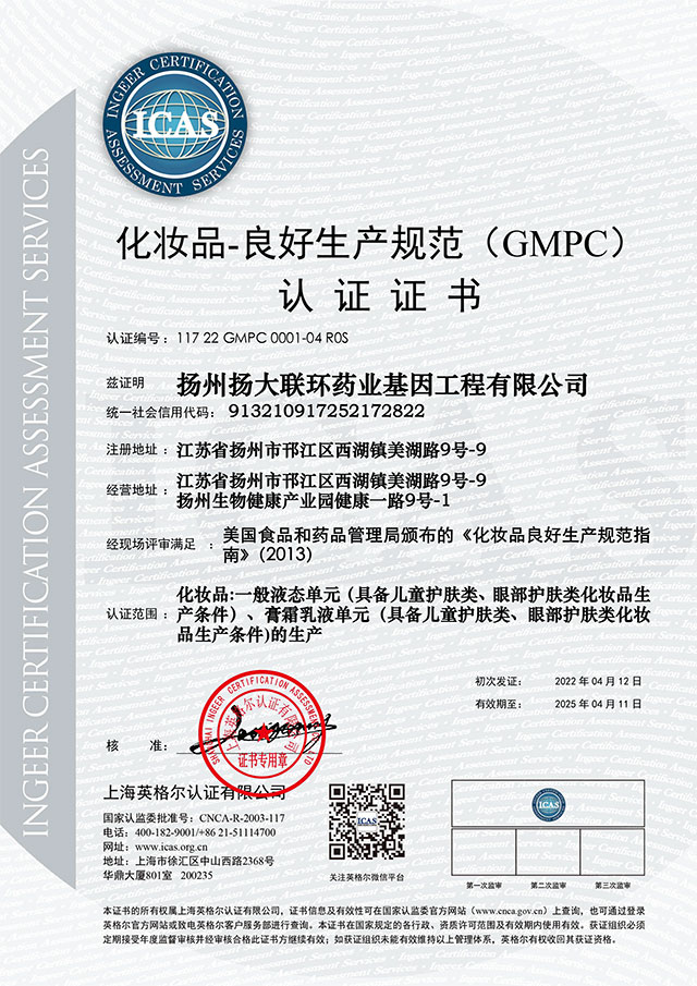 GMPC是一項在全球化妝品領域極具公信力和認可度的專業質量認證標準,ISO 22716 是唯一能夠符合歐盟化妝品法規的GMP 標準。自認證工作啟動以來,聯環基因高度重視,上下齊心,按時完成認證要求的落地、驗證文件的整理等相關工作。同時,克服疫情帶來的影響,采用線上連線、視頻認證的方式有效保證了認證進度。